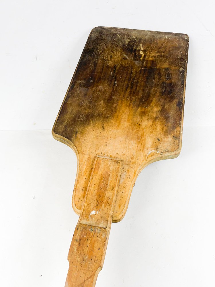 Se encuentra una pala para horno de buena calidad, con un mango de madera y una superficie plana. El mango es de color marrón y la superficie es de tono beige. La herramienta parece estar en buen estado, con detalles como el diseño antiguo y materiales naturales.