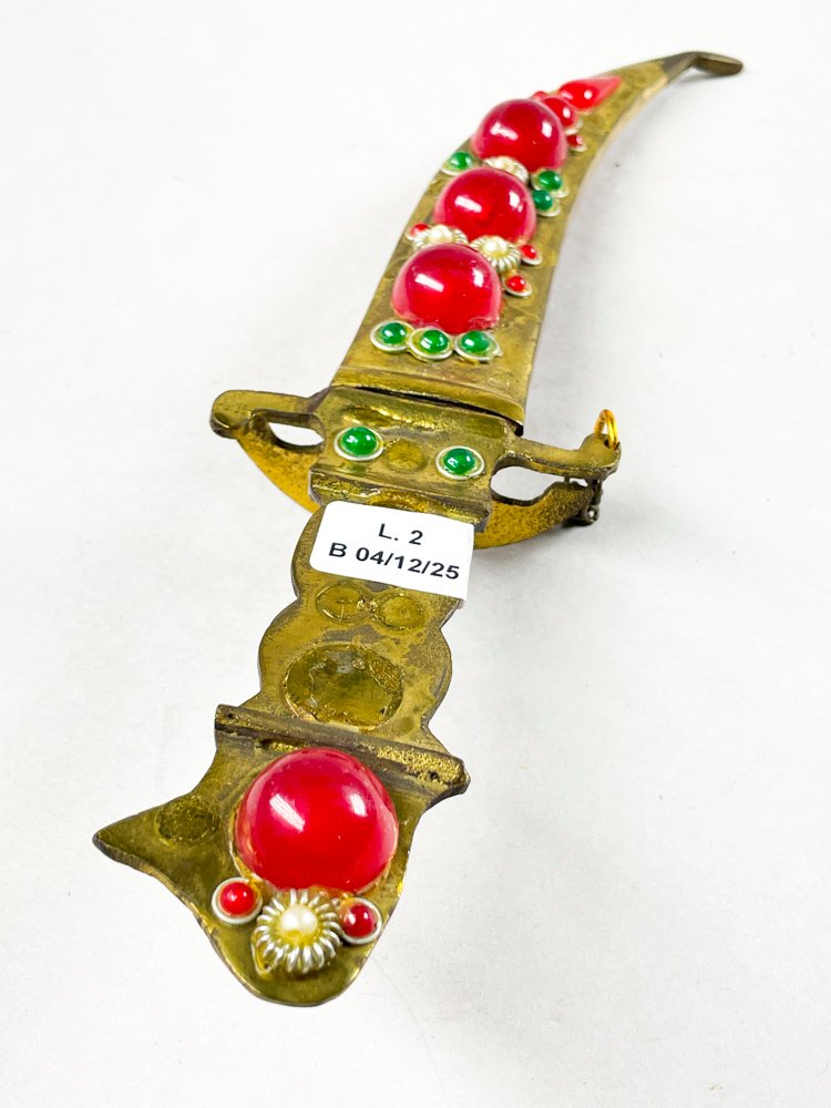 Esta daga turca está hecha de bronce y mide 12,5 cm de hoja. Presenta un diseño ornamentado con bolas coloridas y un mango de latón. Aunque hay algún faltante en el aplicado, la condición general es buena. Se detectaron objetos como 'oro', 'bola roja', 'bola verde' y 'manija de latón'. Los colores presentes son dorado, rojo y verde. Las características incluyen diseño ornamentado, bolas coloridas y manija de latón.