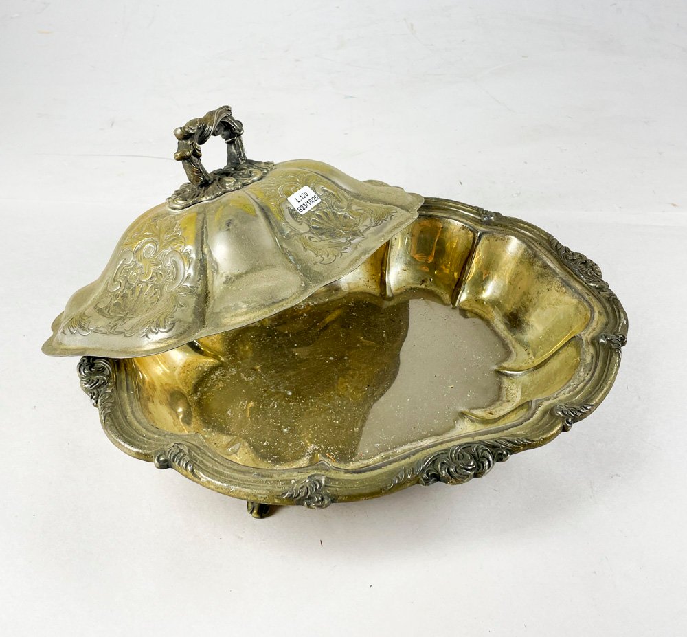 Este centro metálico labrado cuenta con una tapa de oro y plata, lo que lo hace un objeto único y valioso. Según el análisis de las imágenes, se detectaron objetos como metal container, tray y bowl, así como colores como gold y silver. La condición del objeto varía entre excelente, bueno y pobre en diferentes imágenes. Los rasgos destacados incluyen una ornamentada diseño y un mango. Es importante tener en cuenta que el estado de conservación puede variar dependiendo de la imagen analizada.