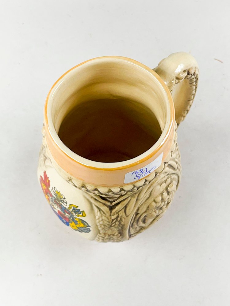 Esta jarra para cerveza está hecha de cerámica y tiene un diseño elegante con un escudo en el frente. Tiene una lid y un mango, ambos en el mismo color que la jarra. En uno de los lados se encuentra un blasón en colores rojo, blanco y azul. La jarra parece estar en excelente condición.