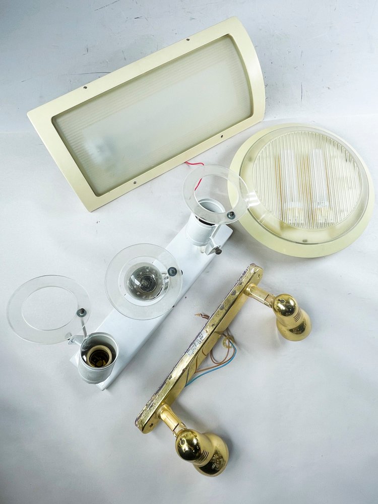 Se ofrece una colección de cuatro piezas, incluyendo un plafón, dos apliques y un objeto de metal. Los objetos están hechos de metal y vidrio y parecen estar en excelente condición. Tienen un acabado brillante y no muestran signos de desgaste o daño. El conjunto incluye una lámpara con base blanca y dos luces, así como un interruptor eléctrico blanco con dos tomas. También se incluye un micrófono de oro con cable.