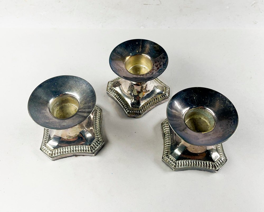 Se presentan tres candeleros de metal de 5 cm, fabricados con materiales de alta calidad y en excelente estado. Los candeleros están hechos de metal y tienen un acabado brillante. No se observan signos de desgaste o daño. Son ideales para decorar cualquier espacio y agregar un toque de elegancia.