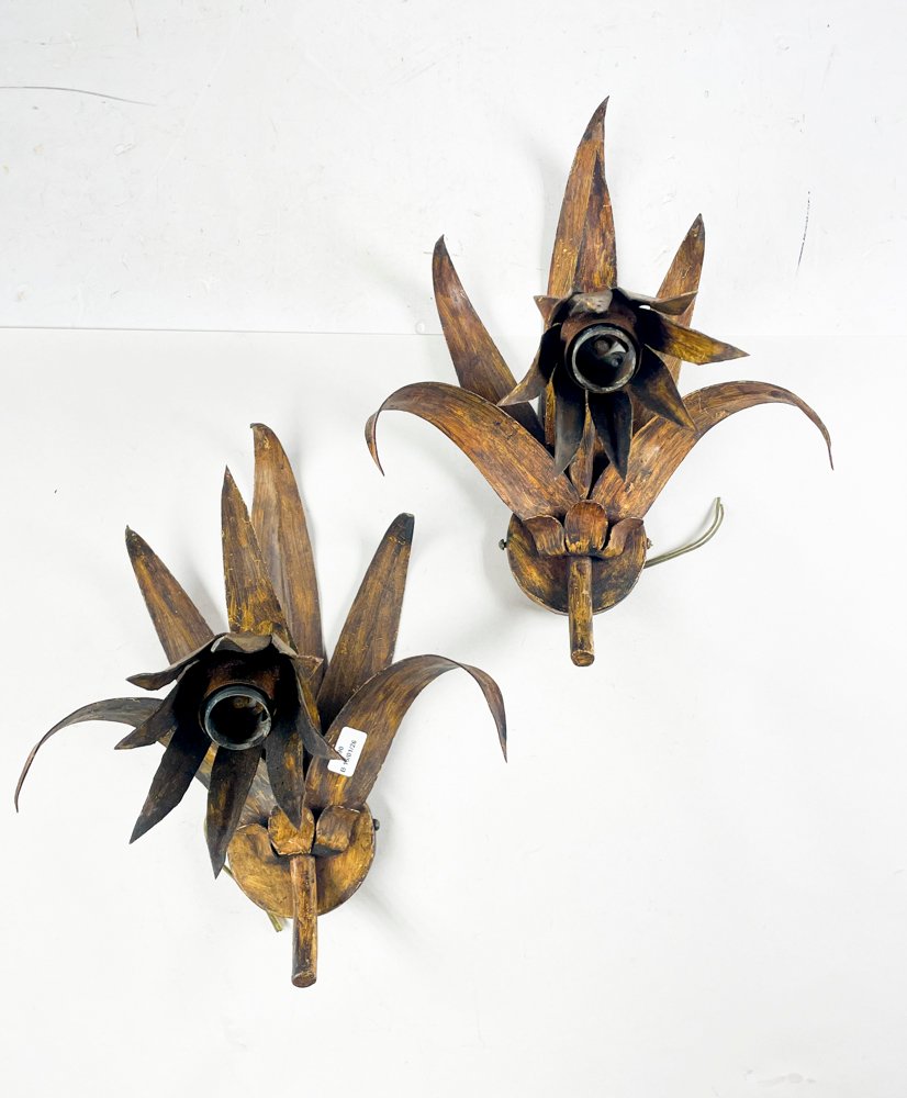 Este par de apliques en metal está compuesto por dos objetos con una apariencia triangular, uno de los cuales tiene un color más oscuro. Los materiales utilizados son metálicos y tienen características únicas como ser de excelente condición, tener un color marrón oscuro y presentar algunas deformidades. Se pueden utilizar para decorar cualquier espacio y agregar un toque de elegancia.