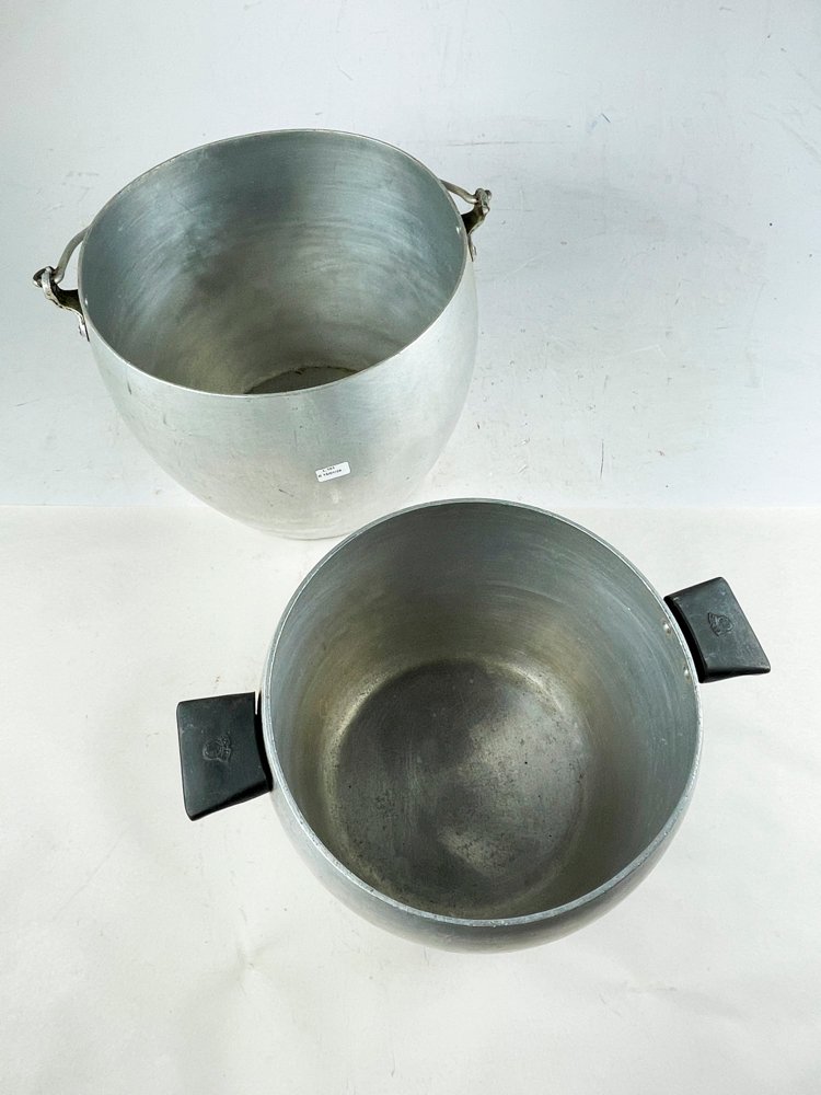 Se ofrecen dos ollas de metal plata, una de 25 x 26 cm y otra de 28 x 31 cm. Ambas están vacías y carecen de tapas. Las ollas están hechas de metal y tienen un acabado brillante. Aunque se detecta que una de las ollas tiene una condición excelente, la otra tiene una condición buena. Los objetos también incluyen dos vasijas de plata, una de las cuales es ligeramente más grande que la otra.