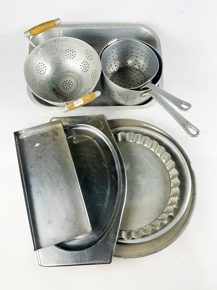 Se ofrece un lote de coladores y bandejas de metal en diferentes tamaños y diseños. Los coladores están hechos de metal y tienen una apariencia colorida con diseños únicos en cada uno. Algunos de ellos tienen diferentes tamaños y diseños, lo que los hace ideales para diferentes necesidades culinarias. Las bandejas también están hechas de metal y vienen en diferentes formas y tamaños, lo que les da una apariencia colorida.