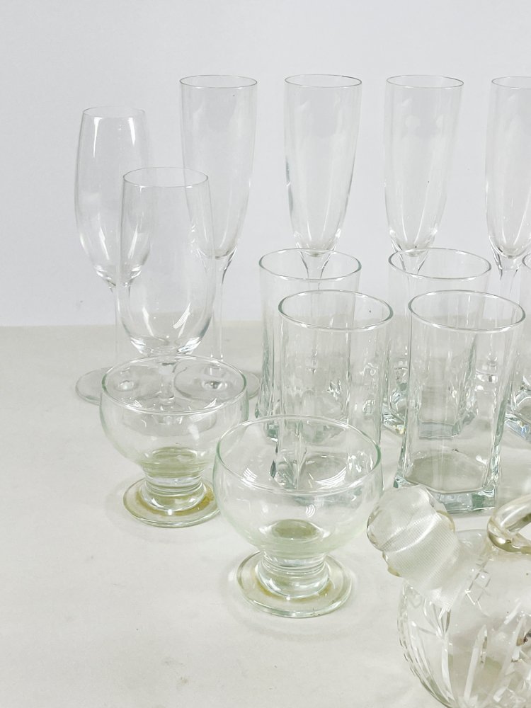 Este lote incluye una variedad de copas y vasos de cristal, perfectos para cualquier ocasión. Se encuentran en excelente condición y están listos para ser utilizados. El conjunto incluye copas de vino, champán, tumbler y vasos decorativos. Los objetos están hechos de vidrio claro y tienen diferentes colores y materiales. Algunos de los artículos muestran signos de desgaste o daño.