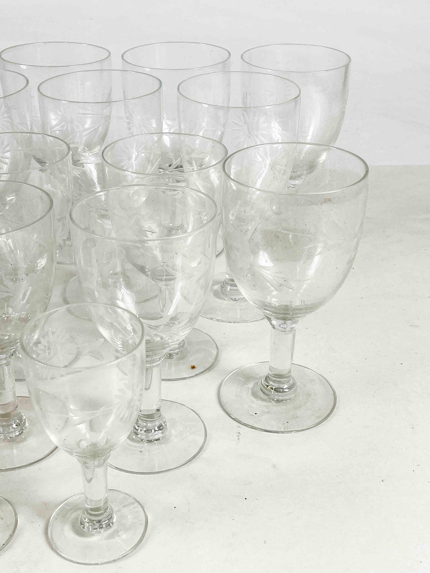 Se ofrece una colección de veinticinco copas de vino hialinas con diseños florales. Están hechas de vidrio y vienen en diferentes tamaños y formas. Algunas tienen un ligero tono, mientras que otras son transparentes. Cada copa tiene un diseño único en la base. Se encuentran en excelente condición, aunque algunas pueden tener algún daño menor.