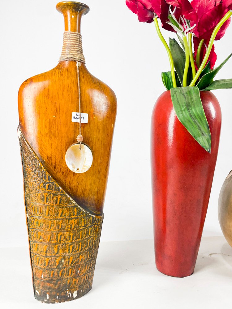 Se presentan tres piezas únicas, cada una con su propio estilo y características. La primera pieza es un florero en cerámica imitación de madera de 47 cm, con un color rojizo característico. La segunda pieza es un jarrón en madera de 36 cm, con un diseño único y detalles decorativos. La tercera pieza es un vaso en cerámica de 31 cm, con una cascada como asa y un color blanco puro. Las condiciones de las piezas son excelentes, buenas y buena respectivamente. Los materiales utilizados incluyen cerámica, madera y vidrio. Las características destacadas incluyen su diseño decorativo, manualidad y unicidad.