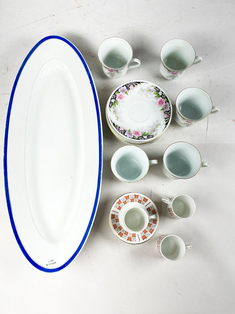 Este lote incluye platos, tazas y platos de porcelana blanca con diseños coloridos. Los platos tienen un borde azul, las tazas están adornadas con patrones florales rojos y naranjas, y los platos presentan diseños dorados. Todos los artículos parecen estar en excelente condición. El conjunto incluye también una tetera y pocillos que se ajustan a las tazas.