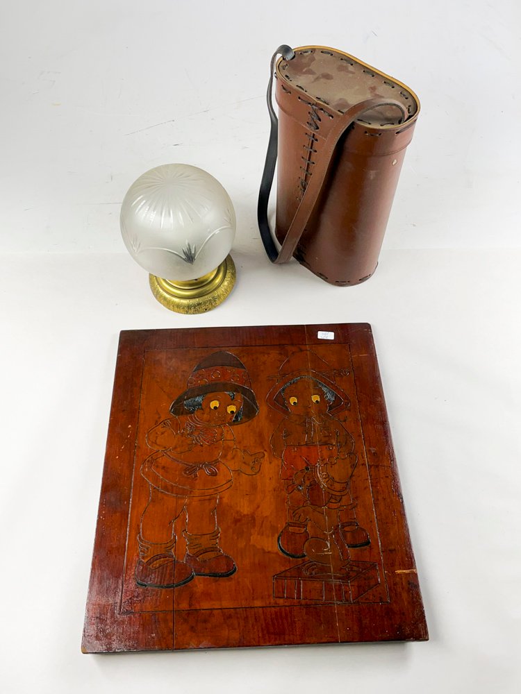 Se trata de tres piezas de madera tallada que incluyen un globo y un cuadro. Las piezas están hechas de madera oscura, posiblemente roble o nogal. Los figuras talladas en las piezas parecen hombres vestidos con trajes y sombreros. El caso de cuero es marrón y tiene una correa negra para llevar. Los objetos están en excelente condición.