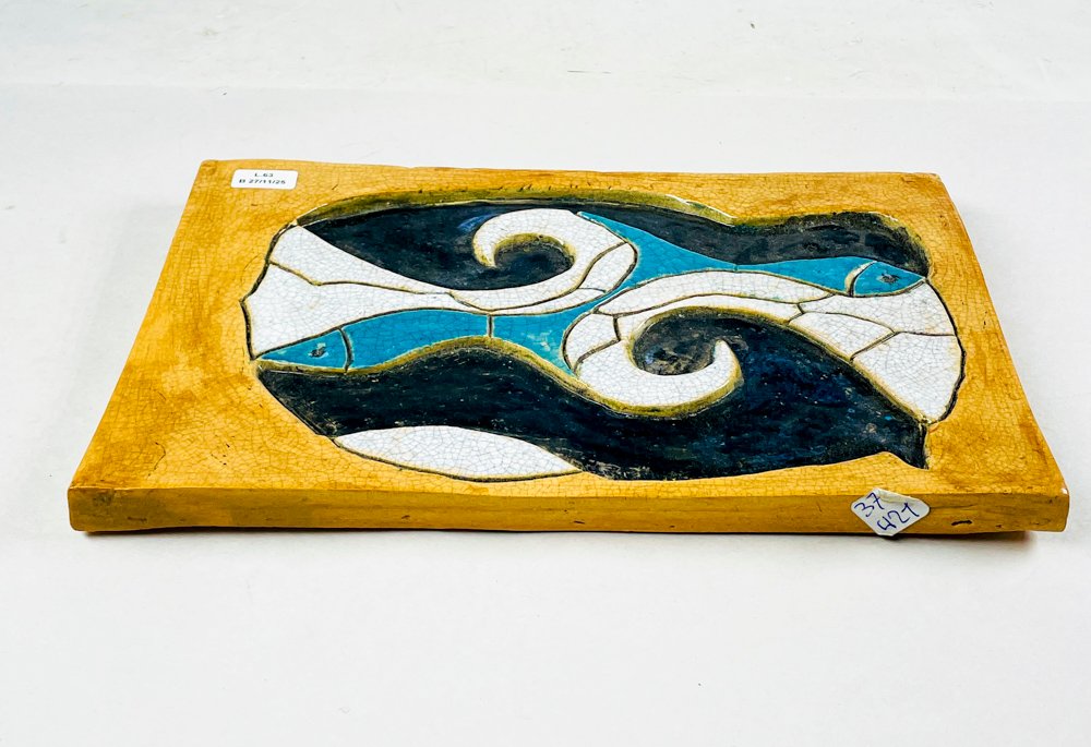 Esta placa cerámica tiene un diseño abstracto con colores azul y blanco sobre un fondo amarillo. La placa está hecha de material cerámico y se encuentra en excelente condición. El diseño abstracto es una característica destacada de esta pieza, lo que la hace única y atractiva para cualquier coleccionista o aficionado al arte.