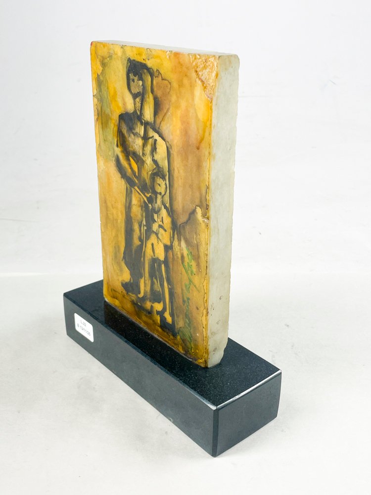 Esta escultura en mármol representa a dos personas, una de las cuales sostiene un libro. La obra tiene una excelente condición y mide 23 cm de altura. Los colores predominantes son beige y gris. Se detectaron varias características interesantes, como la presencia de personas en la escultura.