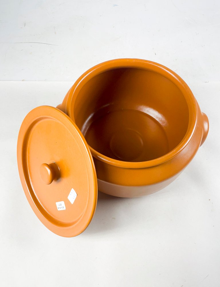 Esta olla cerámica marrón de 22x16 es una pieza única y artesanal. Con un cuerpo redondo y un mango en el lado, esta olla es perfecta para cocinar y decorar cualquier mesa. Hecha a mano con materiales de alta calidad, esta olla tiene un acabado excelente y un diseño colorido que la hace destacar. Su condición es excelente y su material es cerámica.