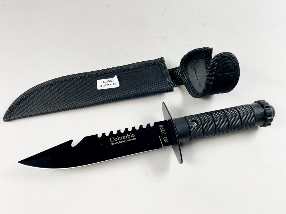 Este cuchillo de caza hoja Columbia tiene una hoja de 15 cm con vaina, hecho de metal. Se detectaron colores negros y plateado. La condición es excelente. Las características incluyen cuchillo de caza hoja, filo afilado, mango de madera y mango para agarre.