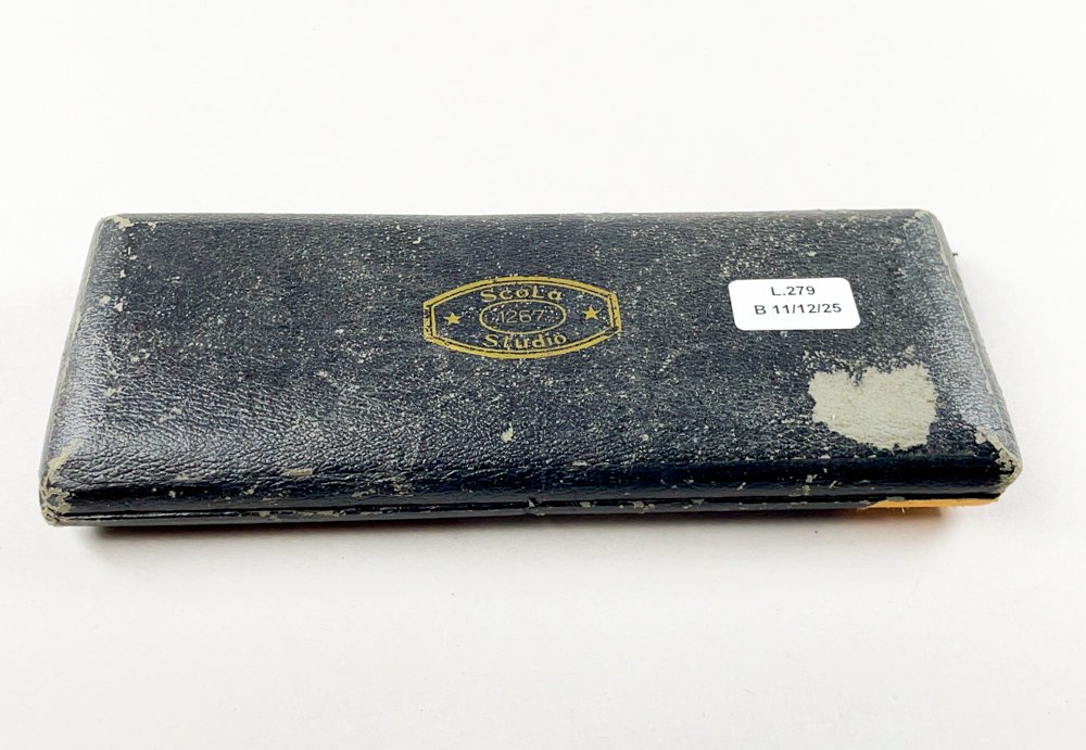 Este juego de compases y tiralineas está en excelente condición, con una caja azul que contiene un conjunto de compases y rectángulos. Los objetos detectados incluyen listas, colores dominantes como el negro, materiales como madera y características como antiguo y desvaído. Es ideal para dibujar y crear obras de arte.