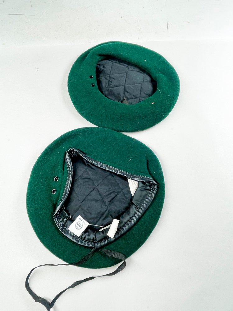 Se ofrecen dos boinas verdes en excelente condición, con identidad de tamaño y forma. También se incluyen dos berets verdes con forro negro interior, en buen estado. Los materiales detectados son fieltro y lana. Las características destacadas son la identidad de tamaño y forma, los berets con forro negro interior y las características adicionales descritas.
